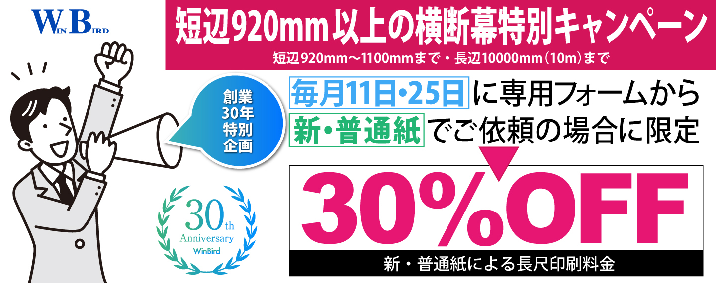 注6)サイズは短辺が920mm〜1100mm・長辺が10000mm(10m)までの横断幕・垂れ幕等の長尺印刷が対象です。長辺2m未満の一般大判は割引対象外です。