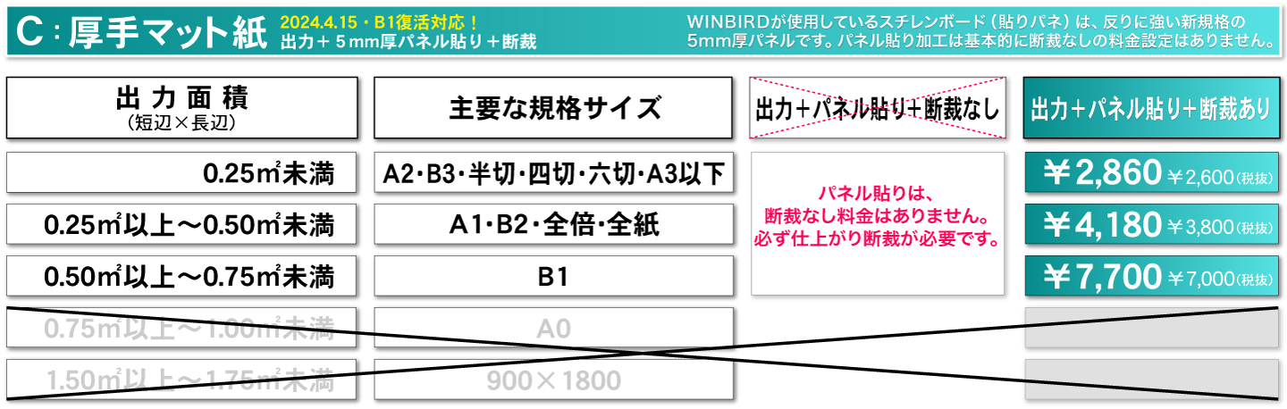■5mm厚パネル貼り+大判印刷:厚手マットの料金表