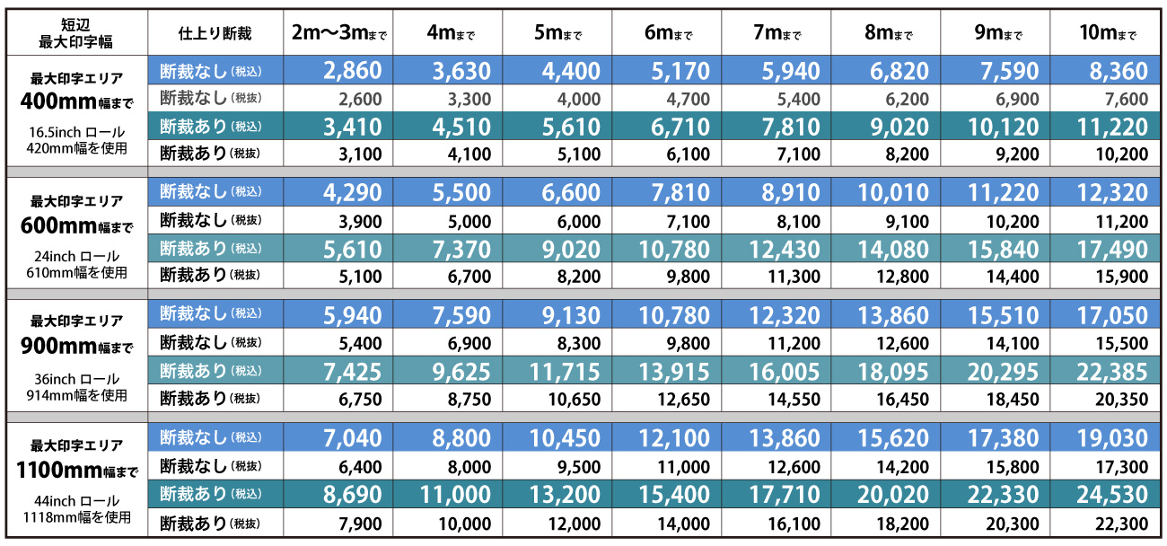 長尺におけるお見積もりご依頼は、必ず絵柄を(プレビュー・画面キャプチャでもOK)拝見してからになります。バック面に帯・色網・グラデーション等の配色があるデザインの場合には新・普通紙ならびに厚手マットは、その長さ・濃度に応じて印刷料金が割増し適用になります。